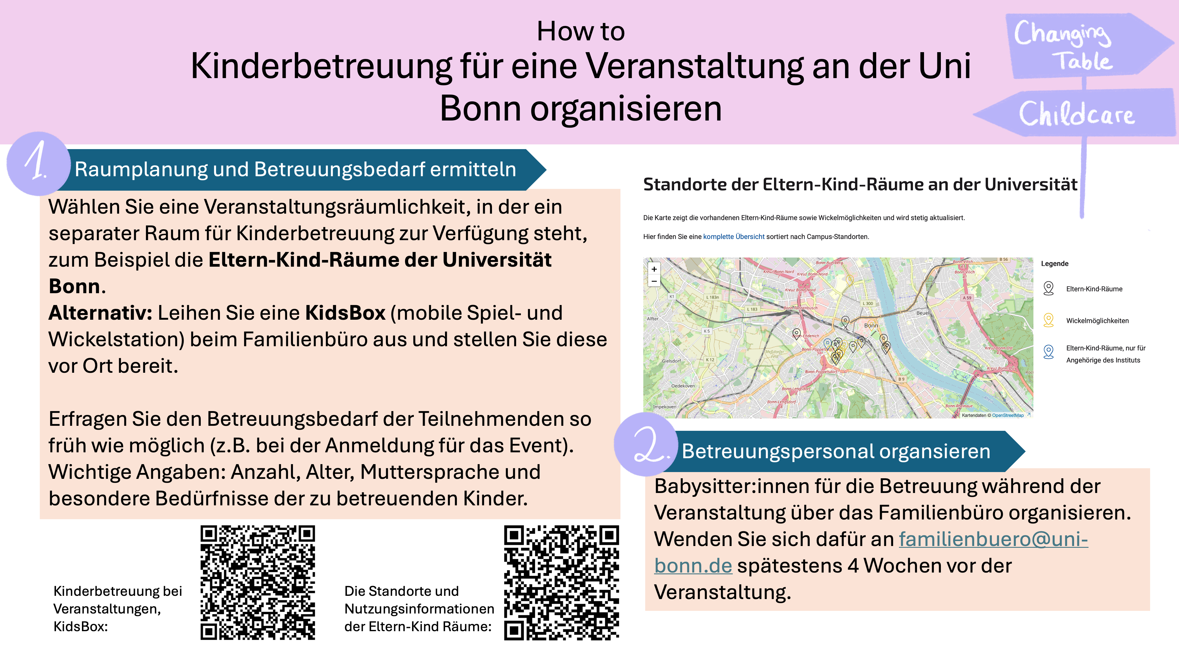 In der unten stehenden Übersicht finden Sie eine Anleitung zur Organisation von Kinderbetreeuung für eine Verantsaltung an der Universität Bonn.